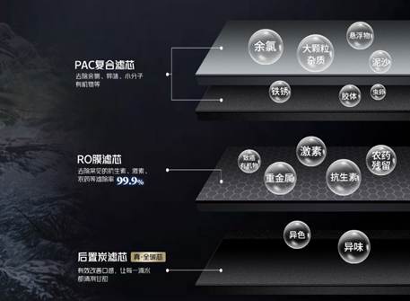 经典三芯系统:采用PAC复合滤芯、反渗透膜滤芯及后置炭滤芯,全方位保障水质。